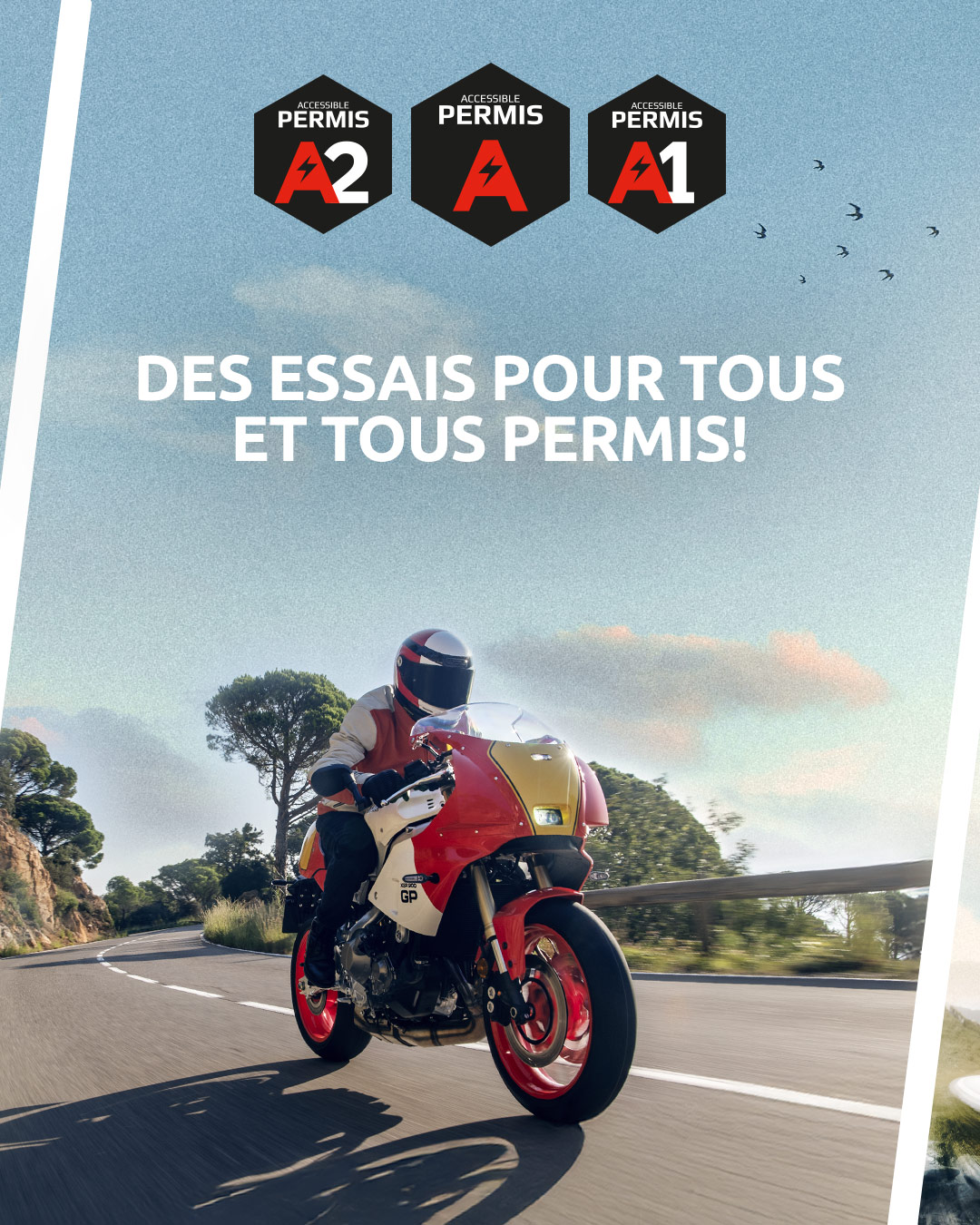 La réponse est oui ! Permis A1, un groupe d'essais composé de 3 modèles 125cc rien que pour vous. Permis A2, du 700cc au 900cc, 10 modèles vous attendent !